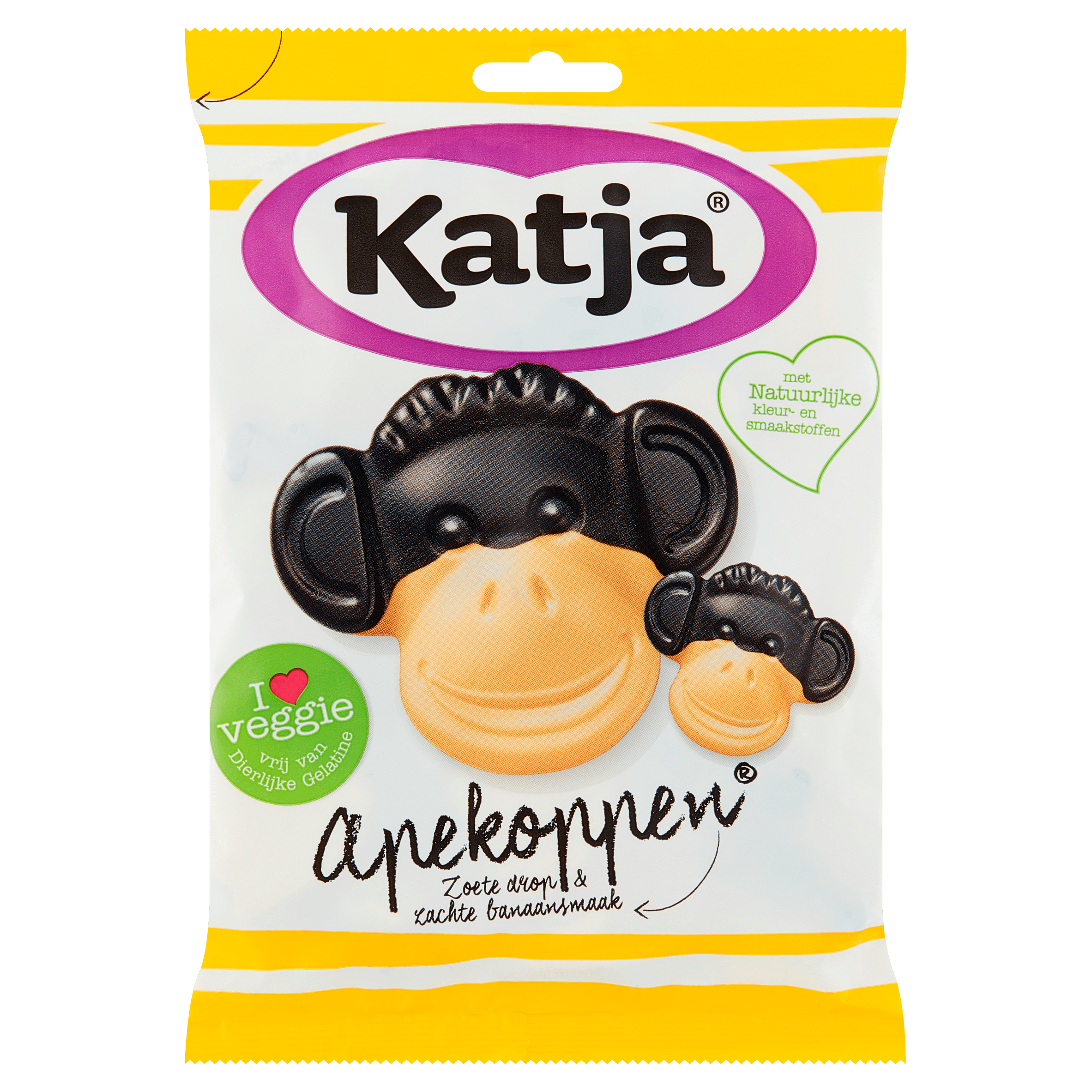 Proef de heerlijke Katja Apekoppen, een unieke mix van zachte zoete drop met de frismilde smaak van banaan. Met natuurlijke kleurstoffen en vrij van dierlijke gelatine, zijn deze snoepjes perfect voor de vegans onder ons. Geniet van de smaak die miljoenen apen al eerder hebben ontdekt!