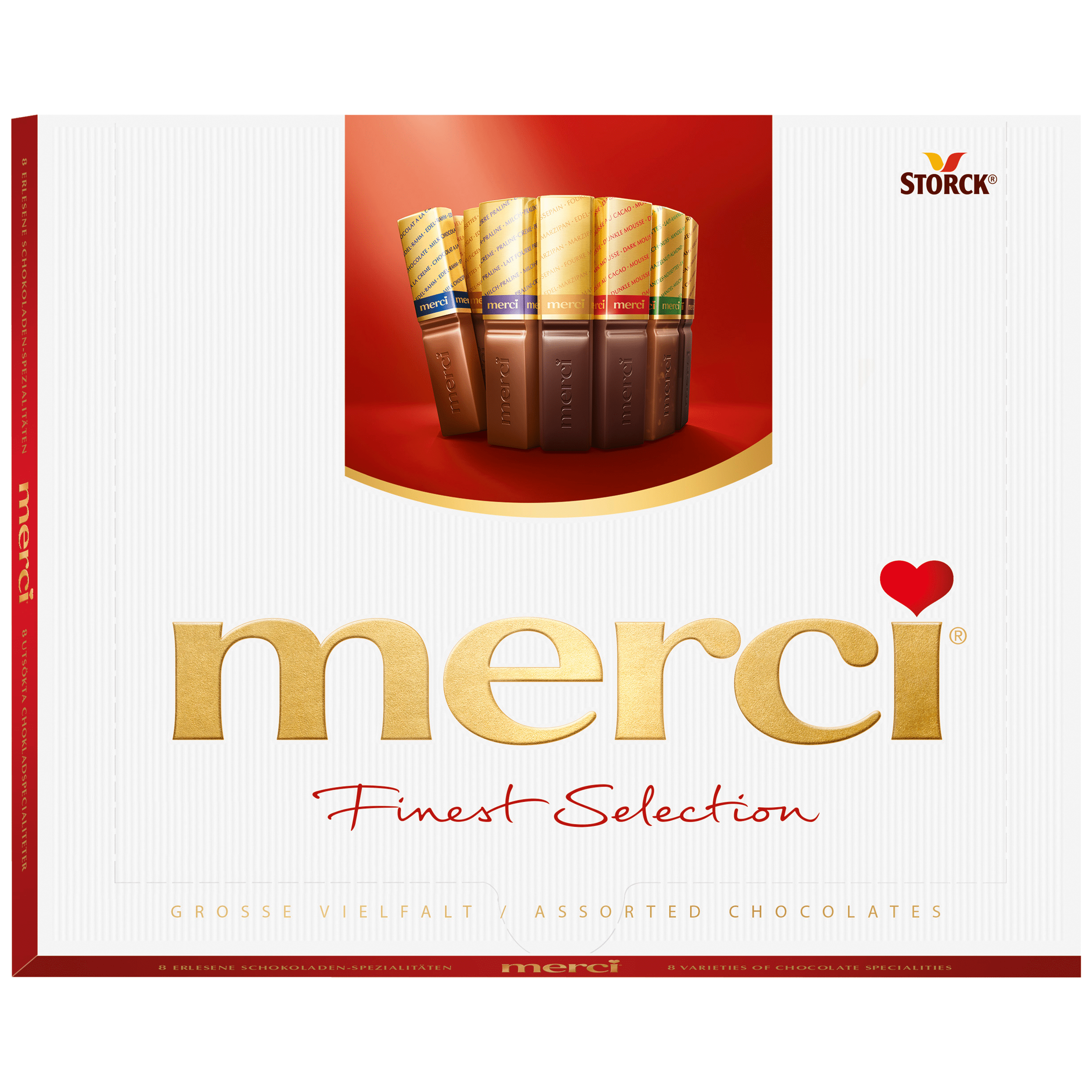 Geniet van de verfijnde smaken van Merci FS assortie, bestaande uit 20 individueel verpakte chocolade reepjes in een luxe gouden verpakking. Deze doos biedt een heerlijke mix van melk en pure chocolade, perfect als cadeau of om uit te delen. Ideaal voor bij de koffie of thee. Met 8 verschillende chocoladespecialiteiten is er voor iedereen iets lekkers te ontdekken!