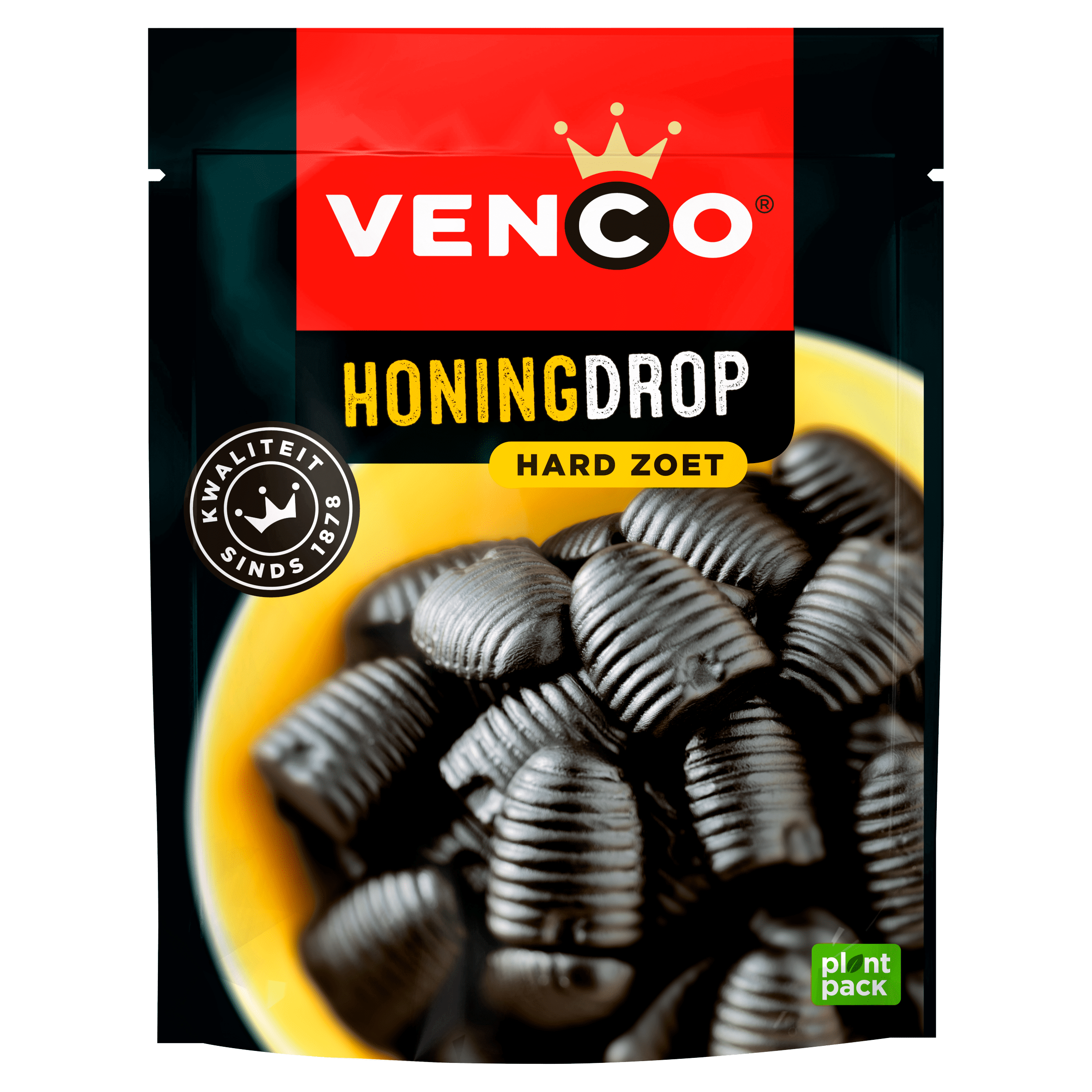Venco Honingdrop zijn heerlijke hard-zoete dropjes met de unieke smaak van salmiak en natuurzuivere honing. Deze authentieke honingdrop heeft de herkenbare vorm van een bijenkorf en is gemaakt met zorgvuldig geselecteerde ingrediënten. Geniet van de karakteristieke honingzoete dropsmaak, perfect om mee te snacken of te delen. De verpakking is bovendien samengesteld uit 50% plantbased plastic, wat bijdraagt aan een beter milieu.