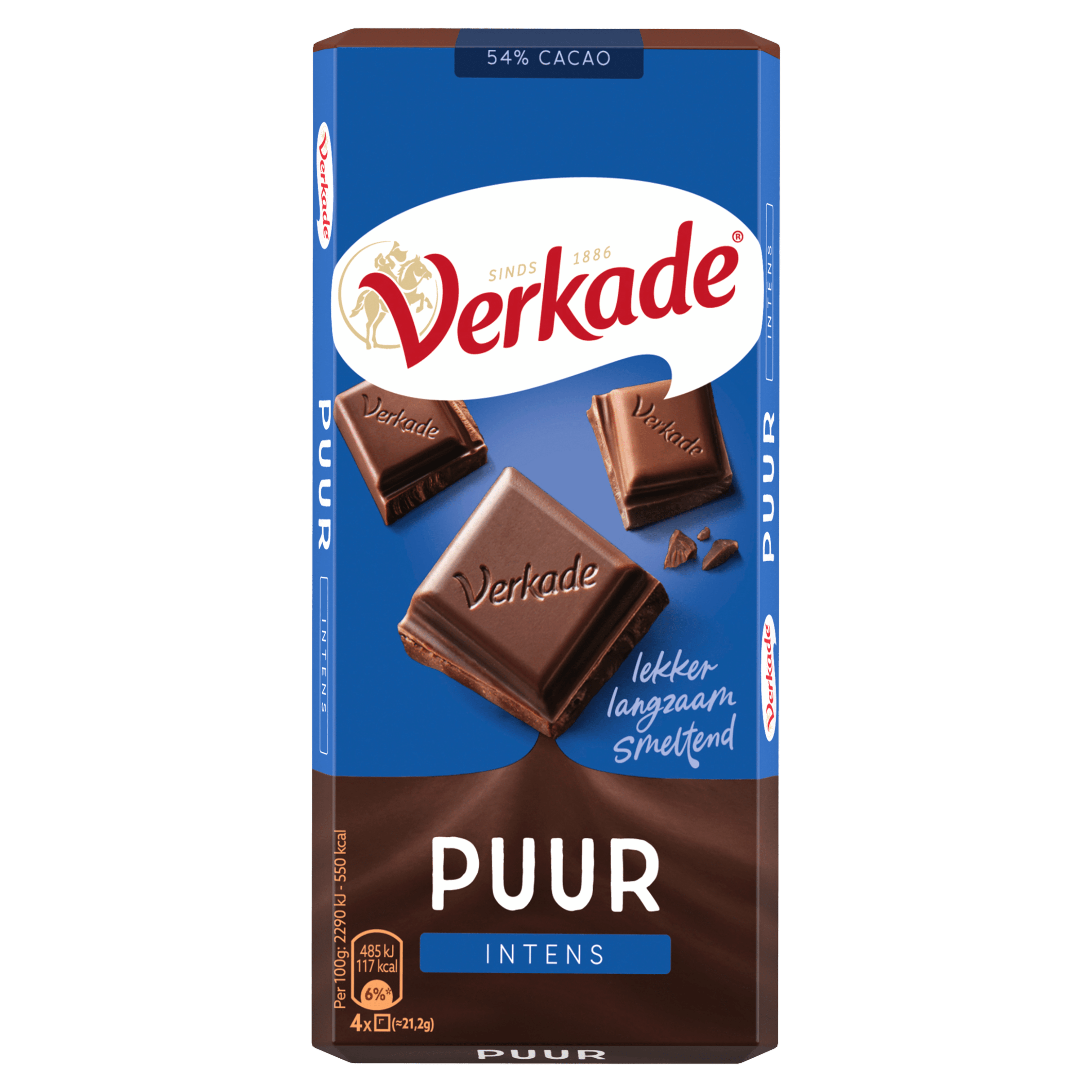 Verkade Intens puur is een heerlijke chocolade reep vol intensiteit en smaak. Deze Fairtrade chocolade is geschikt voor vegetariërs en biedt een puur genot dat al sinds 1886 een populaire keuze is onder de Nederlanders. Bewaar de reep koel, droog en donker voor de beste smaakbeleving.