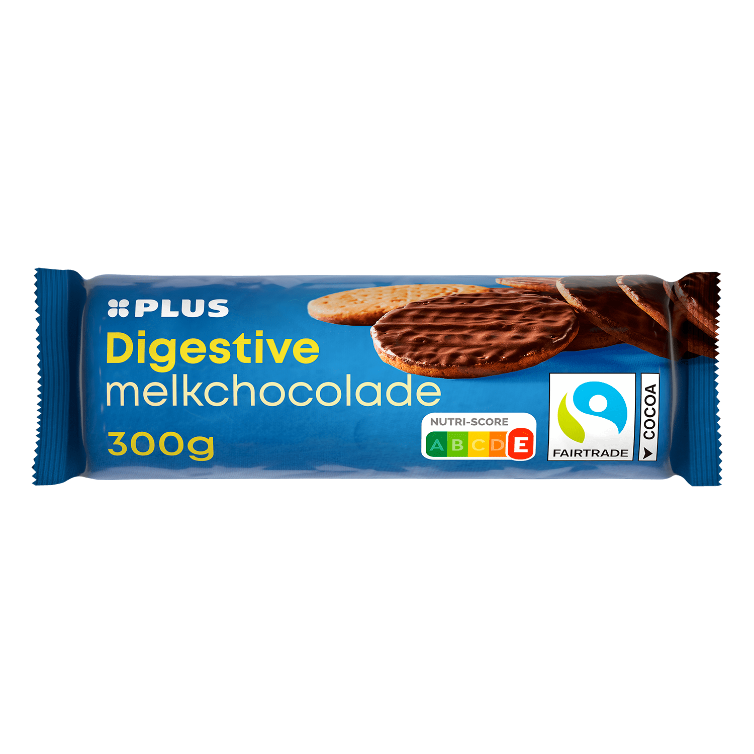 Geniet van de heerlijke PLUS Digestive Melk Fairtrade biscuits. Deze tarwebiscuits zijn rijkelijk bedekt met een laag van 30% melkchocolade, waardoor ze niet alleen een zalige smaak hebben maar ook Fairtrade gecertificeerd zijn. Perfect als traktatie bij de koffie of als een lekkere snack voor tussendoor. Bewaar ze koel en droog voor de beste beleving.