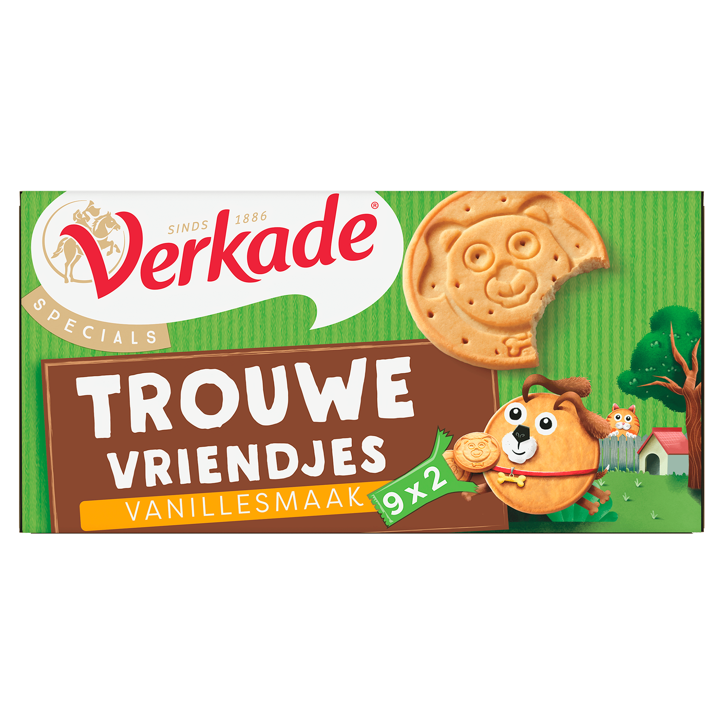 Verkade Koekjes Trouwe Vriendjes zijn heerlijke, brosse koekjes met een verfijnde vanillesmaak. Deze koekjes zijn verpakt in handig formaat zodat je ze gemakkelijk mee kunt nemen naar school of onderweg. Gemaakt met alleen natuurlijke geur-, kleur- en smaakstoffen en geschikt voor vegetariërs. Bewaren op een koele en droge plek voor een langdurige versheid.