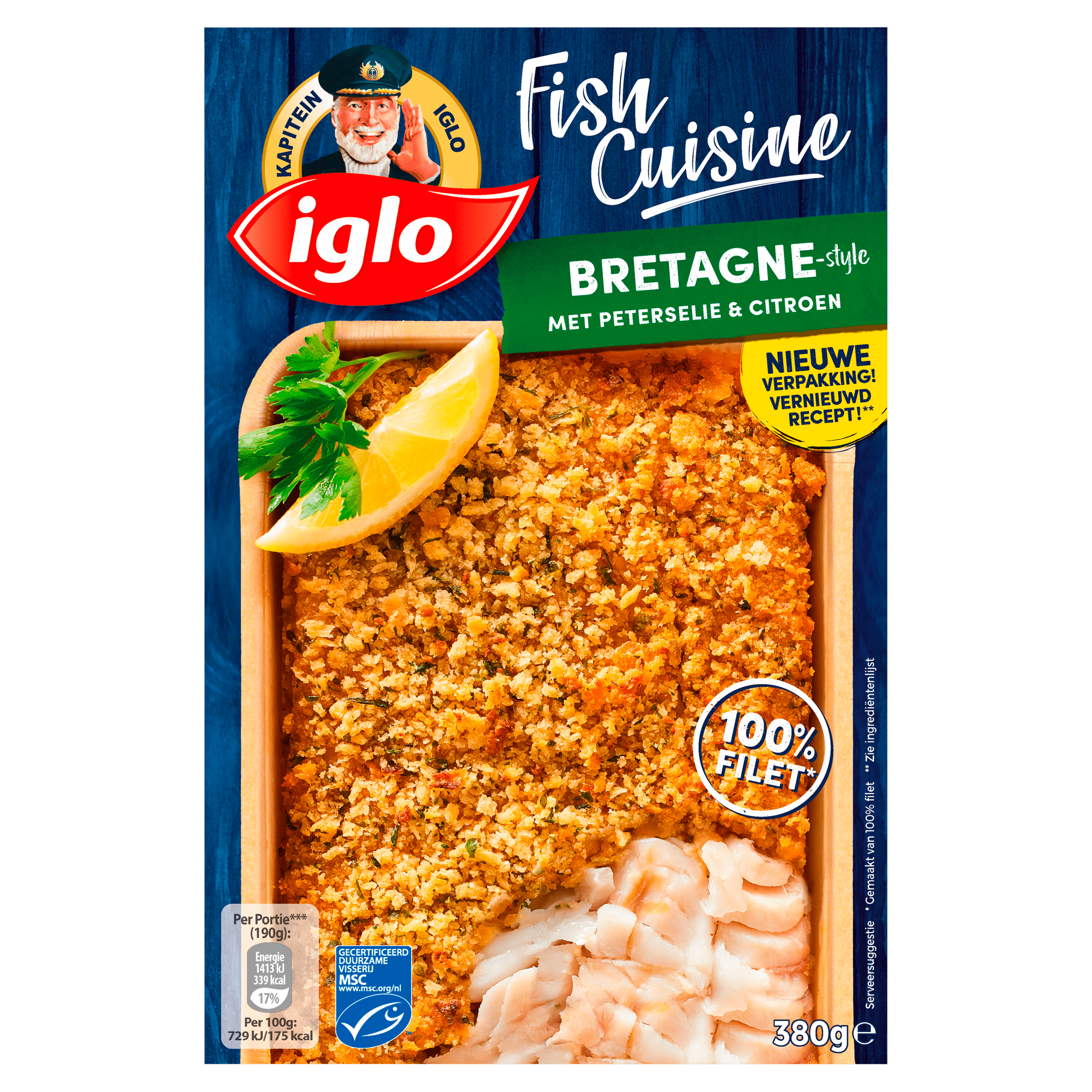 Geniet van de Iglo Fish Cuisine Bretagne, een heerlijke visgratin die snel en eenvoudig te bereiden is in de oven of magnetron. Gemaakt van 100% Alaska koolvis, bedekt met een krokante topping en subtiele smaken van citroen en peterselie. Dit MSC-gecertificeerde product is een natuurlijke bron van Omega-3, zonder kunstmatige smaak- of kleurstoffen. Ideaal voor een smaakvolle maaltijd.