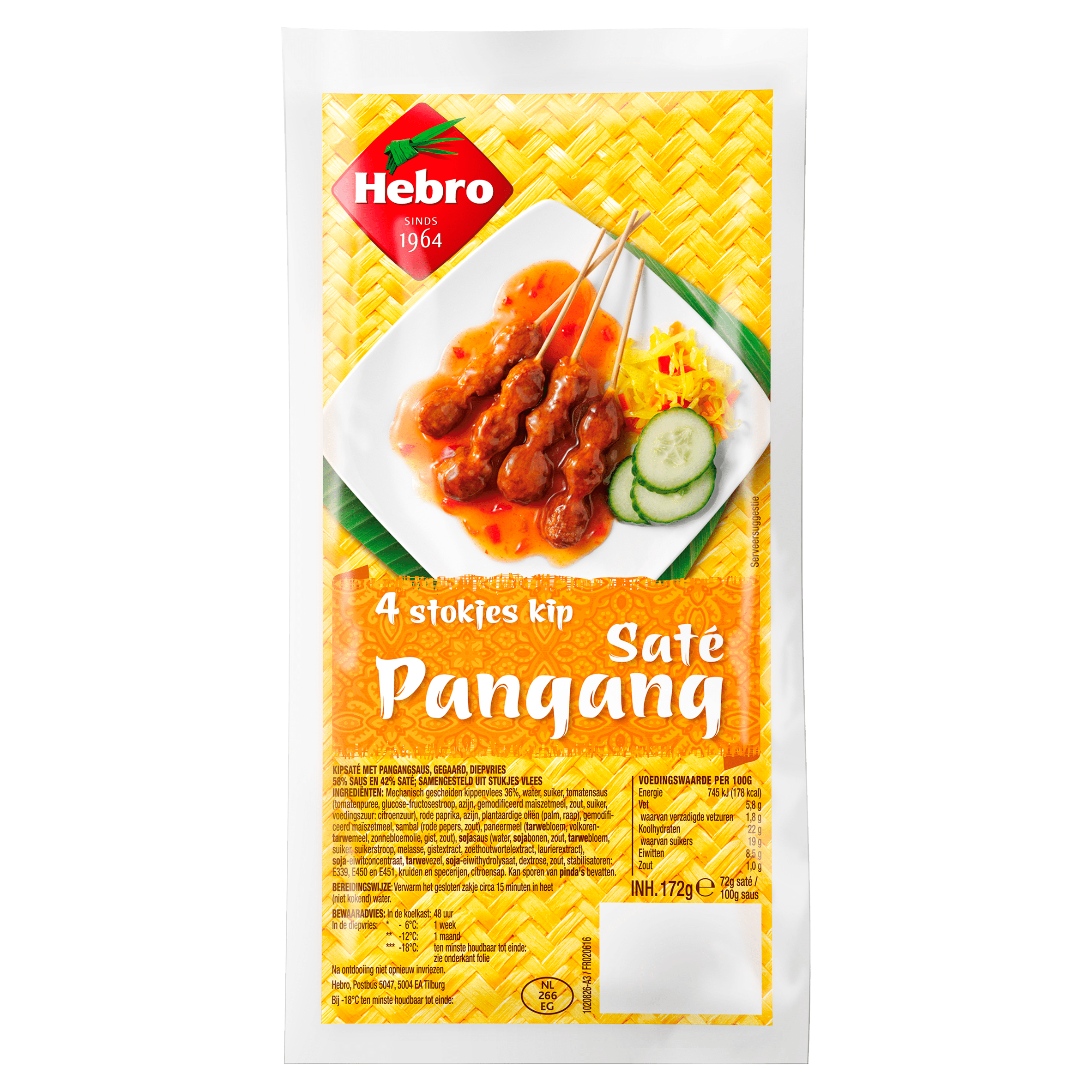 Geniet van de overheerlijke Hebro 4 Stokjes Kipsaté Pangang, perfect gekruid en ideaal voor elke gelegenheid. Vriesvers en gemakkelijk te bereiden in ong. 15 minuten in heet water. Deze kipsaté bevat een smakelijke pangangsaus en is ideaal voor een snelle maaltijd of als borrelhapje. Bewaar in de koelkast of diepvries voor optimale versheid.