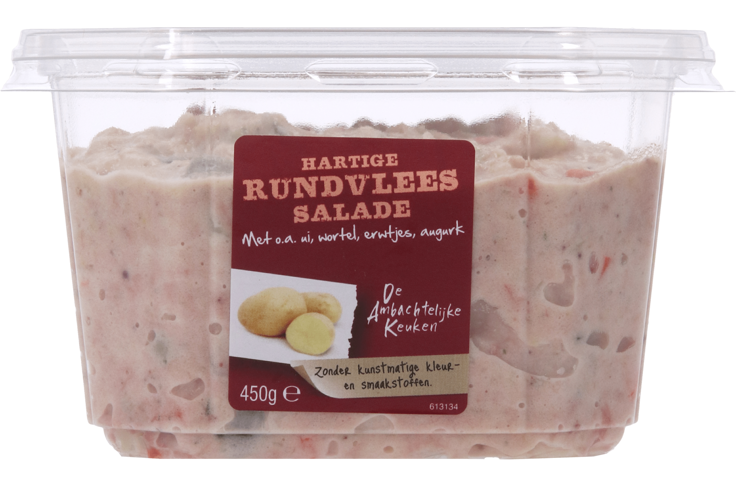 Geniet van de Ambachtelijke Keuken Rundvlees salade, een hartige en smaakvolle mix van verse aardappelen, malse stukjes rundvlees, en een medley van groenten zoals wortel, ui, en augurk. Deze salade is bereid zonder kunstmatige kleuren en smaakstoffen, en is zowel gluten- als lactosevrij. Perfect voor een snelle lunch of als bijgerecht bij een barbecue.