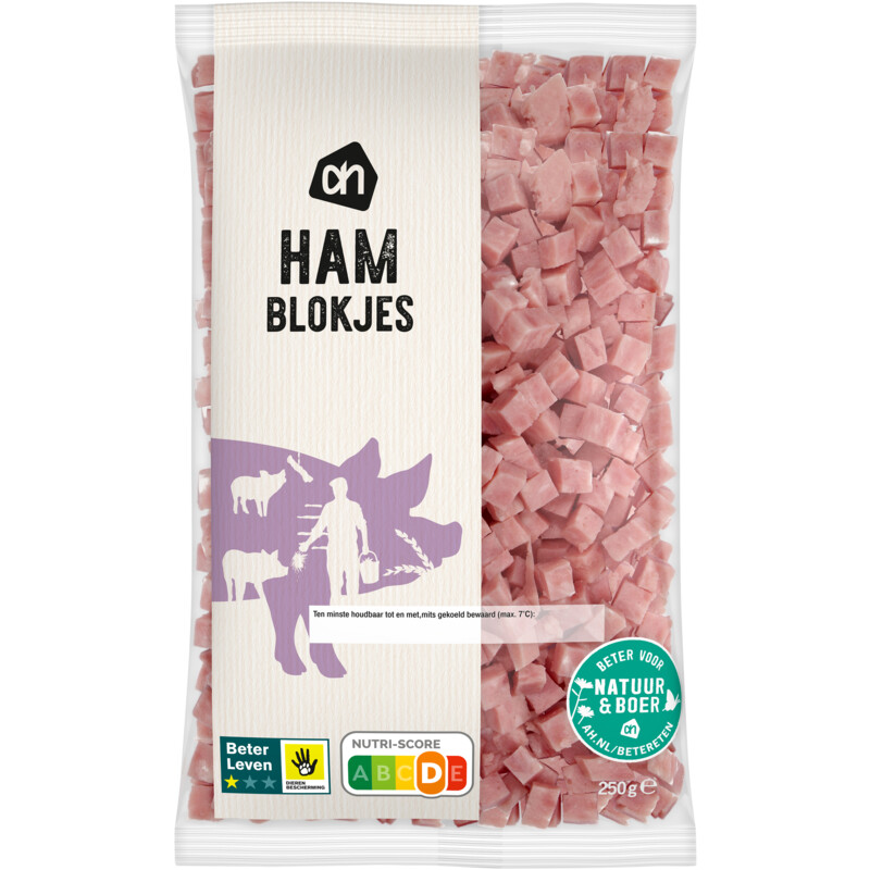 De AH Hamblokjes zijn perfect gekookte stukjes ham, gemaakt van 74% varkensvlees en zorgvuldig bereid voor een rijke smaak. Deze hamblokjes zijn veelzijdig in gebruik en maken gerechten nog lekkerder. Of je ze nu gebruikt in salades, om een pastagerecht op smaak te brengen of als topping op een pizza, met deze hamblokjes creëer je eenvoudig een heerlijke maaltijd. Bovendien zijn ze Beter Voor Natuur & Boer, wat bijdraagt aan een duurzamere voedselketen.