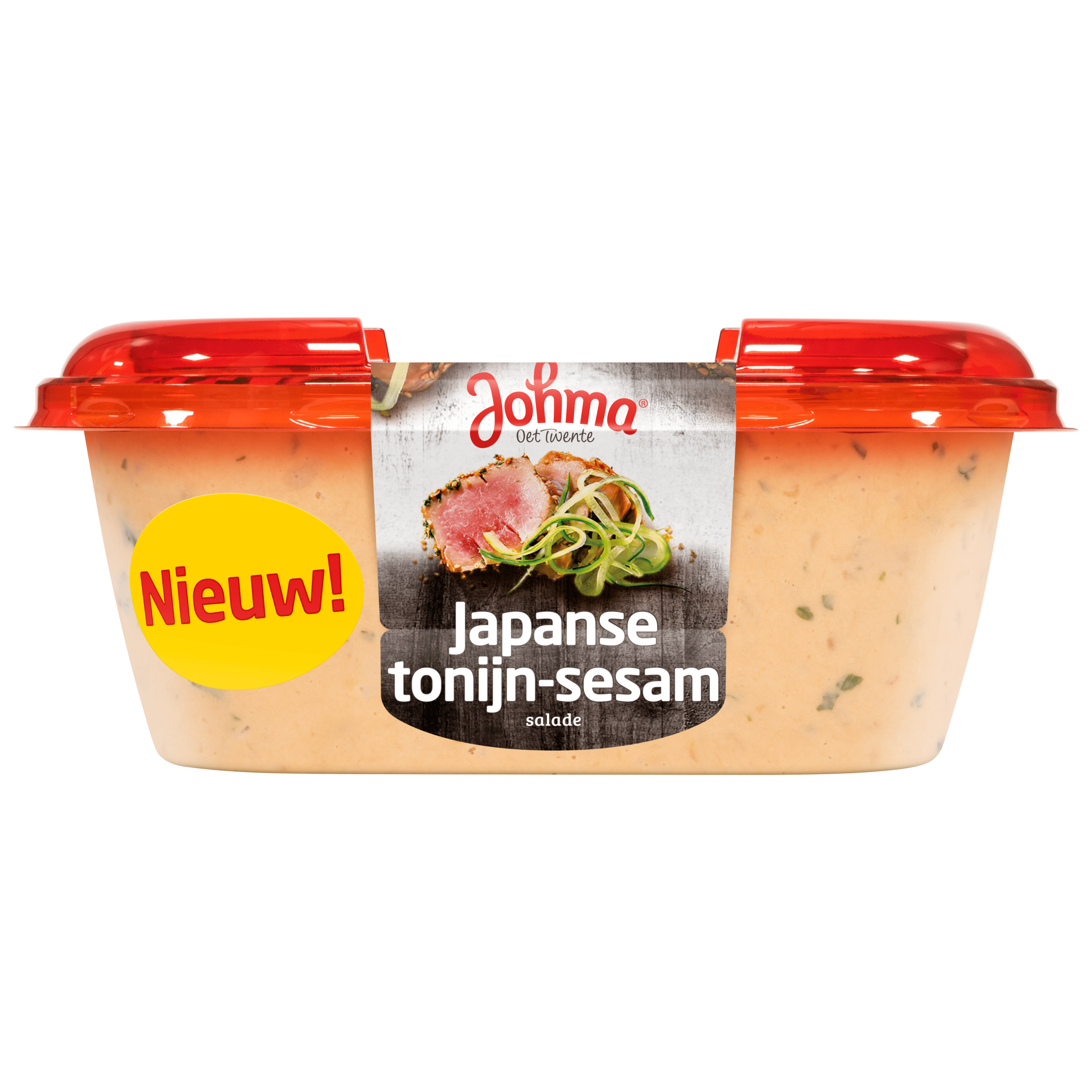 Geniet van de verrukkelijke Johma Japanse tonijn-sesamsalade, een rijkgevulde salade met 46% gekookte tonijn die perfect in balans is met frisse komkommer, geroosterde sesamzaadjes en een subtiele mosterdtouch. Deze salade is een smakelijke aanvulling op je lunch, perfect voor op een broodje of als borrelhapje. Johma staat al sinds 1968 bekend om het maken van de allerlekkerste salades in Nederland, en deze is geen uitzondering. Bewaar gekoeld voor de beste smaak.