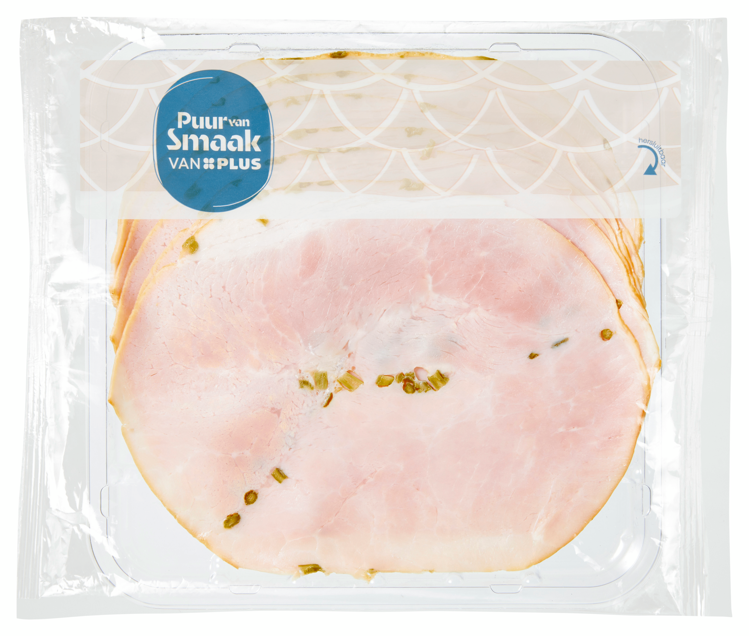 Geniet van de heerlijke PLUS Puur van Smaak ham met asperge, een premium gekookte achterham met een unieke smaakcombinatie van 96% varkensvlees en frisse asperges. Dit product, voorzien van het Beter Leven keurmerk 1 ster, is perfect voor een verantwoorde lunch of maaltijd. Bewaar gekoeld voor de beste kwaliteit.