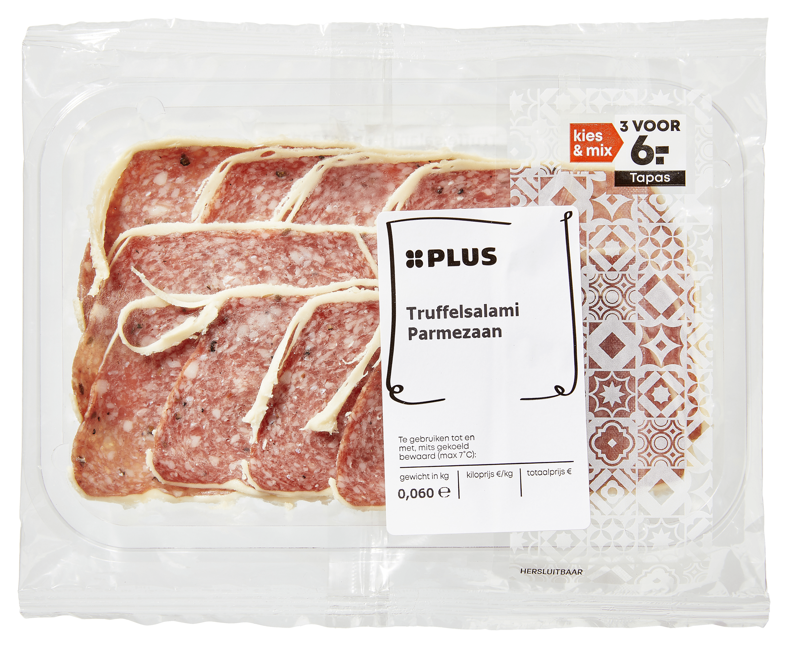 Ontdek de verrukkelijke PLUS Truffelsalami met parmezaan, een smaakvolle combinatie van gefermenteerd en gerookt varkensvlees verrijkt met 7% Parmezaanse kaas en een hint van aromatische zwarte truffel. Perfect voor een luxe borrelplank of als een smakelijke toevoeging aan je gerechten. Bewaar de salami gekoeld en geniet van de rijke smaken, ideaal voor tapas en meer.