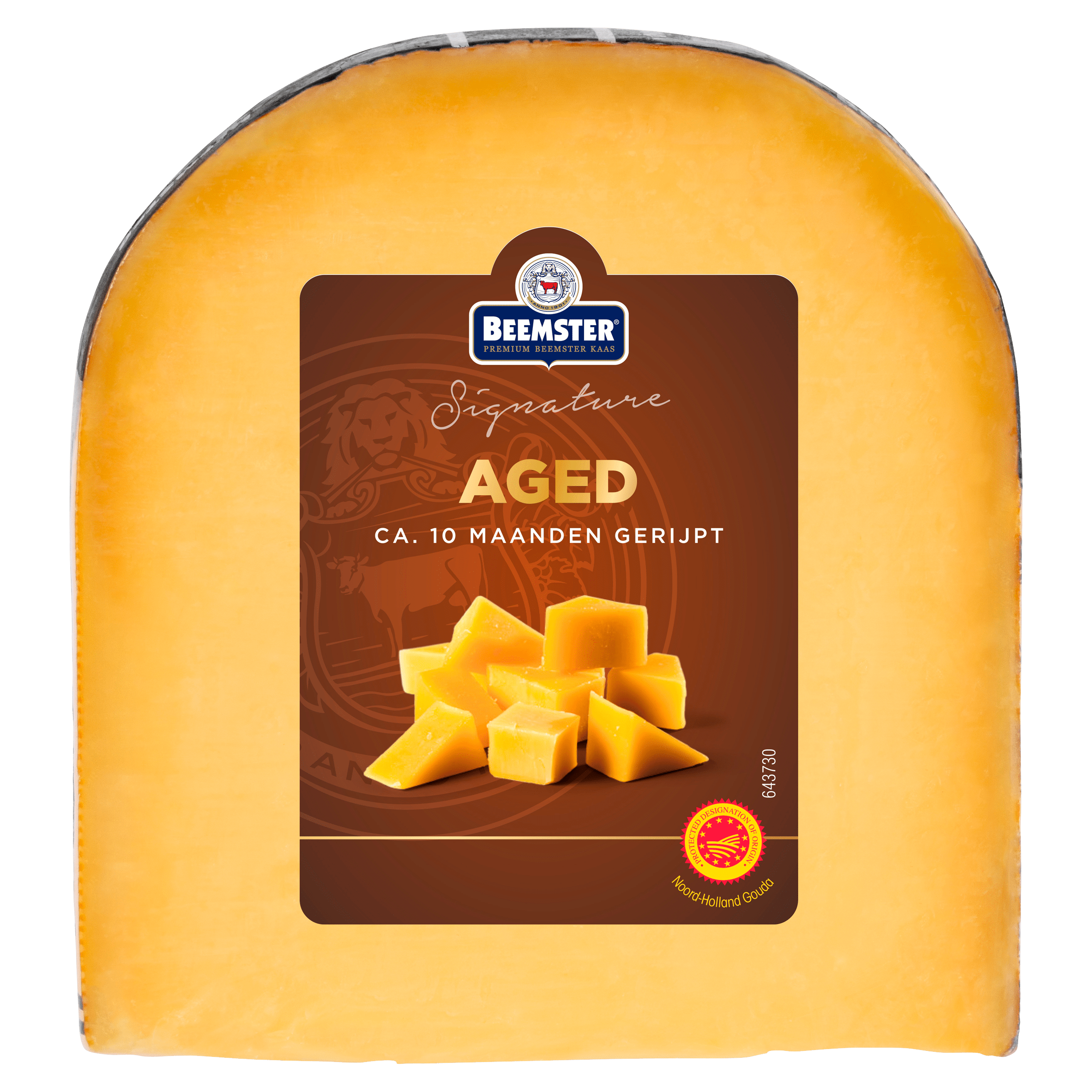 Beemster Signature Aged 48+ is een premium, lang gerijpte kaas gemaakt van 100% verse Noord-Hollandse weidemelk. Deze kaas staat bekend om zijn pittige en rijke smaak, perfect voor bij de borrel of als luxe snack. Gemaakt met oog voor mens, dier en milieu, is de kaas volledig klimaatneutraal. Geniet van deze ambachtelijke lekkernij, die met liefde en aandacht is geproduceerd in de Beemster polder.