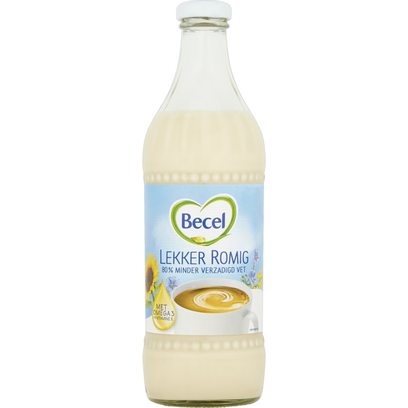 Becel Romig voor in de Koffie geeft je koffie een heerlijk romige smaak. Deze unieke blend van 4% plantaardige oliën en magere geëvaporeerde melk levert niet alleen een luxe koffiemoment, maar ook belangrijke voedingsstoffen zoals omega 3 en vitamine E. Dankzij de 80% minder verzadigd vet verbruik je een gezondere optie voor je dagelijkse koffie. Ideaal als alternatief voor room in sauzen en gerechten zoals gratins of omeletten. Maak je maaltijden en dranken extra romig met Becel!