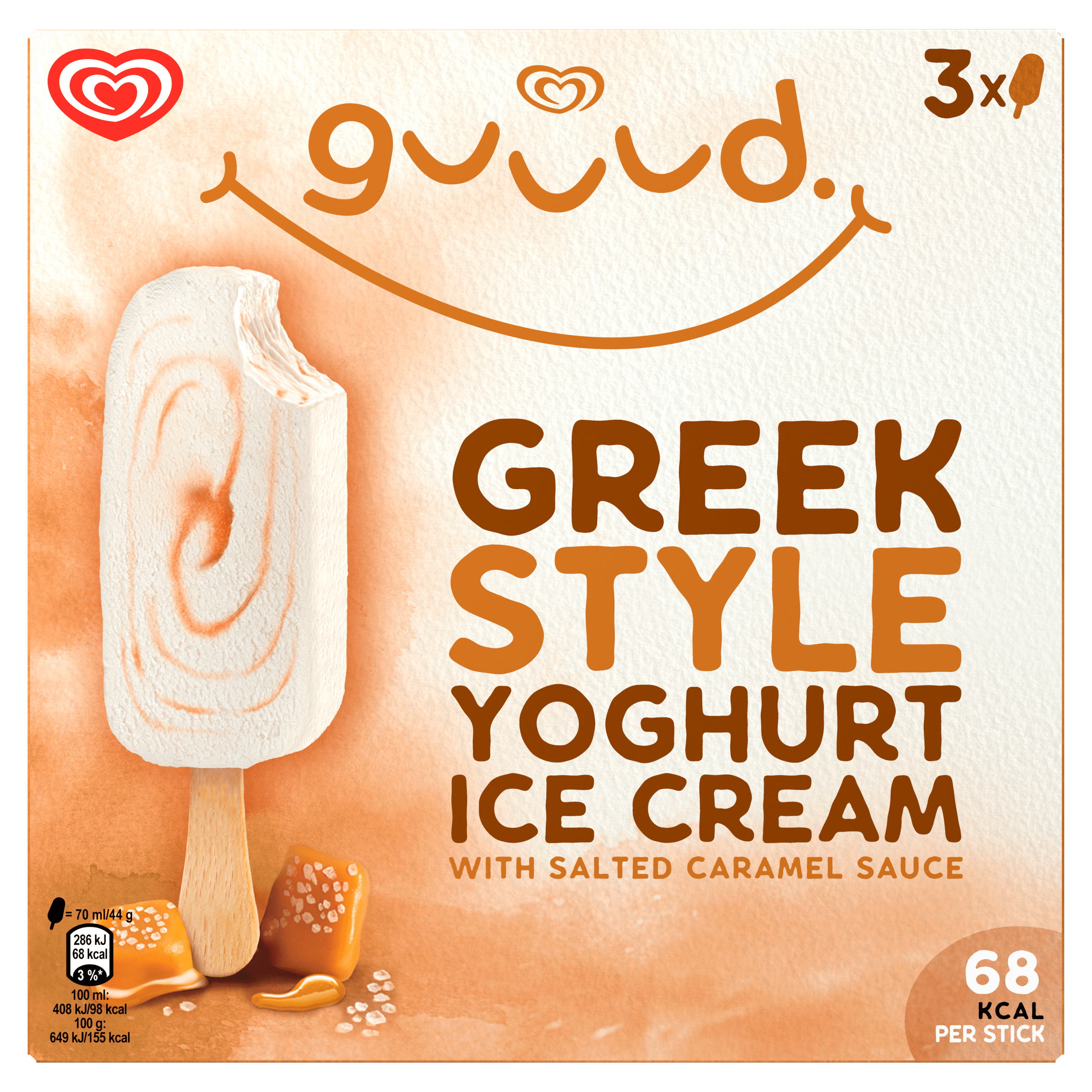 Geniet van de rijke en romige Ola Guuud Greek Style Yoghurt Salted Caramel Stick, een heerlijk yoghurtijsje bereid met Griekse stijl magere yoghurt en verrukkelijke gezouten karamelsaus. Dit ijsje is niet alleen een traktatie, maar ook een bewuste keuze met slechts 68 kilocalorieën per stuk. Bewaar het bij -18°C voor een ideale smaakervaring.